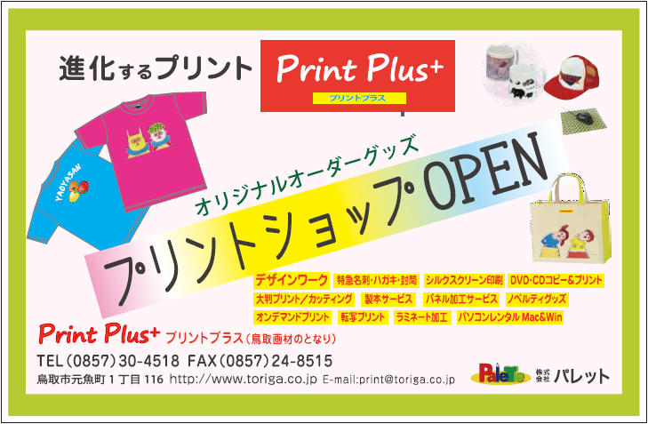 オリジナルオーダーグッズのプリントショップ【プリントプラス】が、鳥取画材のとなりにOPENいたしました。